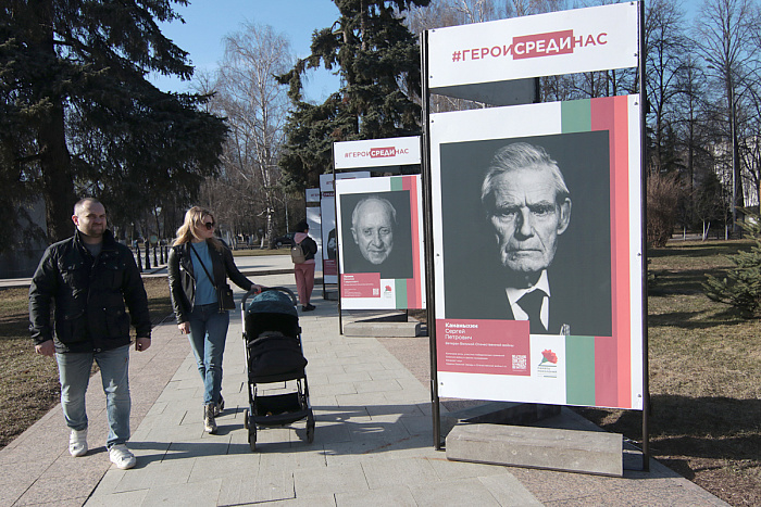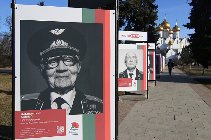 Самому старшему участнику фотосессии сейчас 101 год, самому молодому – 35. В своих работах фотографы знакомят нас с ветеранами, Героями Советского Союза и России. 19 черно-белых портретов разместились на аллее позади Вечного огня.