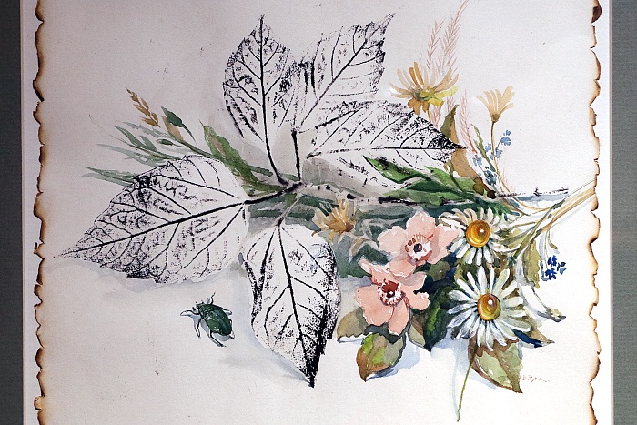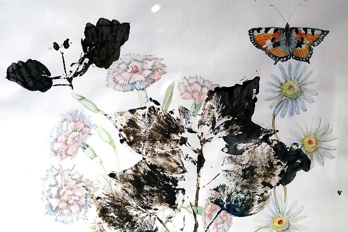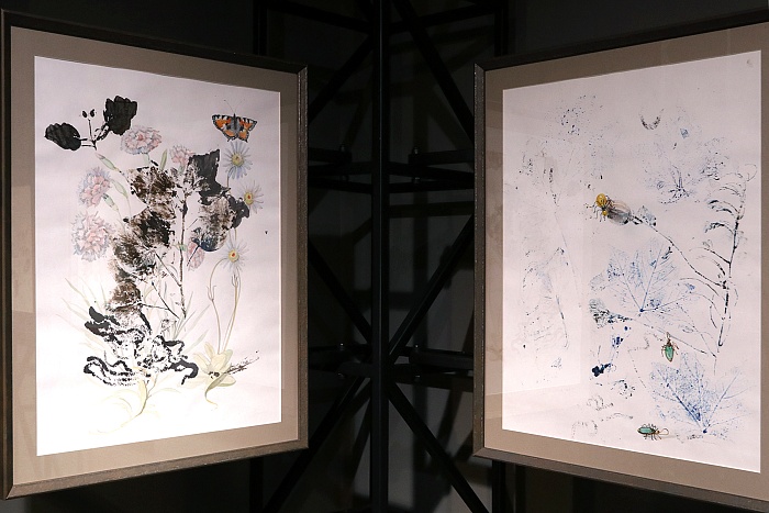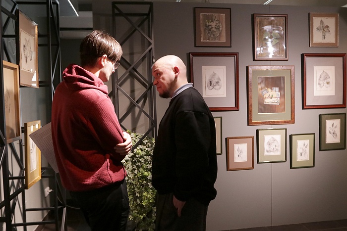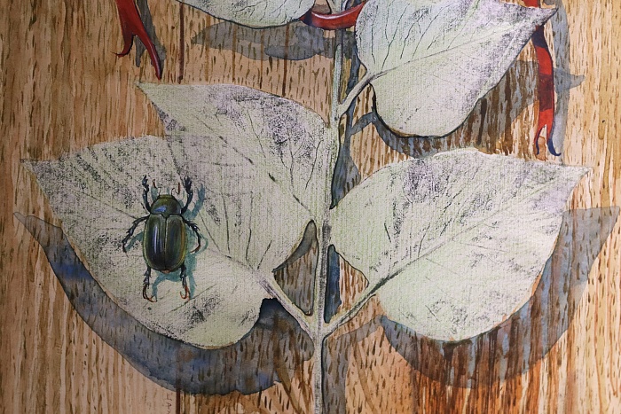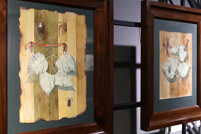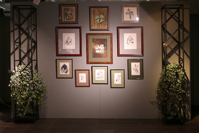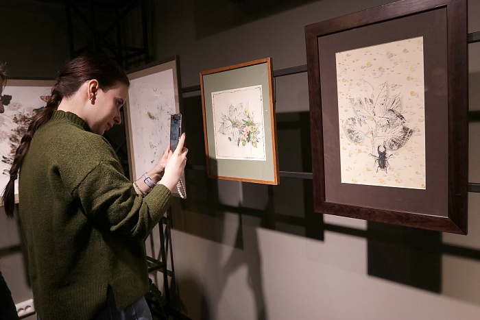 Небольшой зал превратился в настоящий сад. Картины, на которых зрители видят жуков и бабочек, соседствуют с пышными растениями. Среди листьев, на стойках и даже на стенах гости выставки то и дело встречают реалистично выполненных представителей фауны.