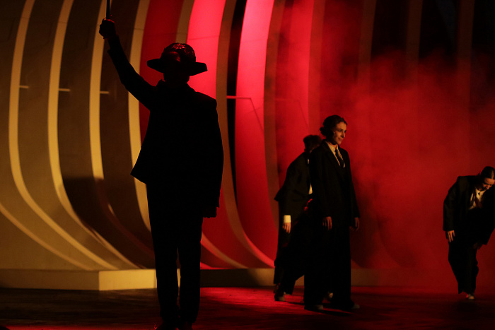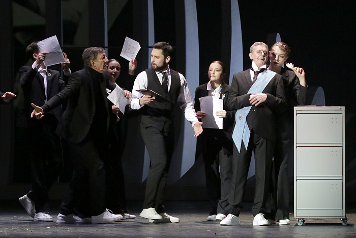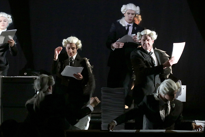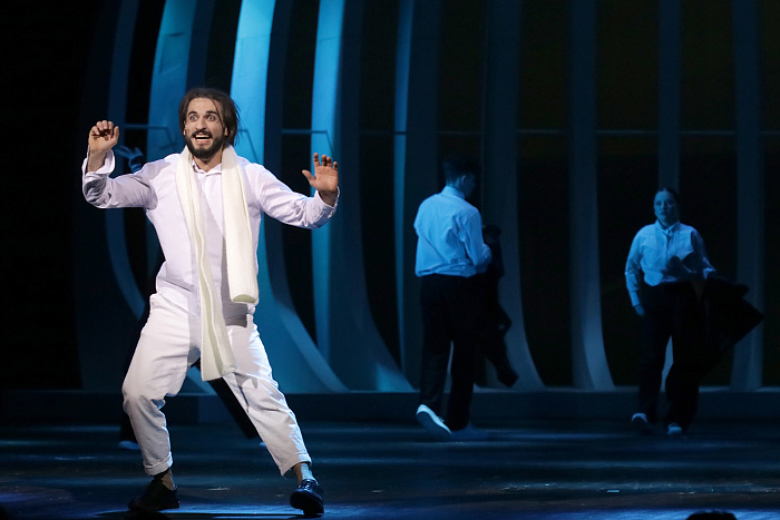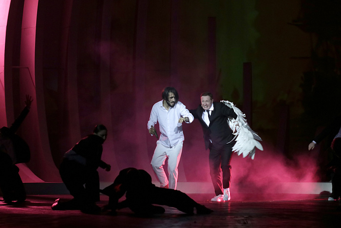 В спектакле сплетены две части. Одна – предельно четкая, реалистичная. Это судебный процесс в небесной канцелярии с ее ящиками, шкафчиками, тетрадями учета. И однокрылыми ангелами, которые участвуют в процессе в том или ином качестве. Вторая часть – биографическая, жизнь Ивана Айвазовского, она наполнена метафорами, образами, складывающимися из многоплановых видеоизображений, оживших с помощью нейросети картин, музыки и минималистичной декорации, напоминающей одновременно волну и чрево кита (привет «Левиафану»?).