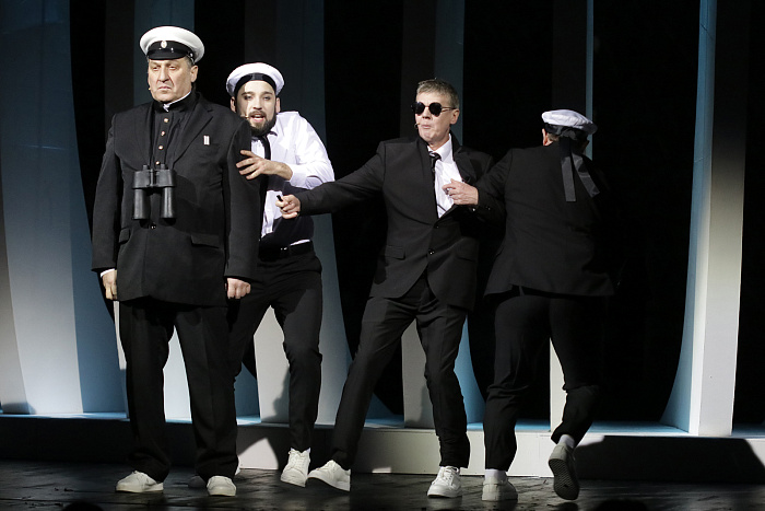 Каждый спектакль Волковского театра – как метафорическая карта. Все видят одну и ту же причудливую картинку, но каждый воспринимает ее по-своему, исходя из собственного жизненного опыта и состояния души. В этом плане «Айвазовский» не исключение. Александр Созонов наполнил пьесу ярославского драматурга Светланы Гиршон символами, смыслами, образами. Сюжет пьесы – суд над Айвазовским (Эрик Тарханидис) в небесной канцелярии. Айвазовский – гений, а посему суд затянулся с 1900, когда художник умер, аж до 2024 года. На стороне защиты ангел-хранитель (Юрий Круглов). Обвинение поддерживает Адвокат дьявола (Евгений Мундум), тоже ангел, но его задача беспристрастно изложить факты биографии.