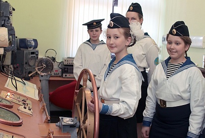 Ребята на практике изучают движение судов по Волге вверх-вниз. Тут же карта всех океанов и морей 60-х годов. Ее нашли на чердаке и отреставрировали. Рядом камбуз, класс флажного семафора, истории российского морского костюма, военной подготовки, шлюпочный класс, где изучают такелажное дело.