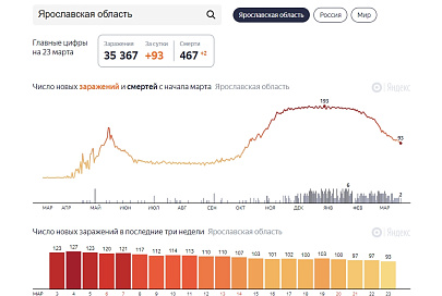 Диагностирован ковид за минувший день у 93 жителей Ярославской области. Это новый минимум 2021 года, последний раз такой уровень заболеваемости был зарегистрирован в середине октября прошлого года. С начала эпидемии в регионе ковидом болели 35 367 человек.