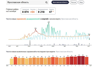 Заболели коронавирусом 54 человека. Это меньше, чем в выходные дни, когда ежедневный прирост заболеваемости фиксировался на уровне 60 человек. С начала эпидемии в Ярославской области корнавирусом заболели 8874 человека.