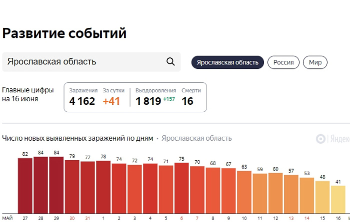 41 житель Ярославской области заболел коронавирусом за прошедшие сутки. Общее число заболевших в регионе – 4 162 человека.