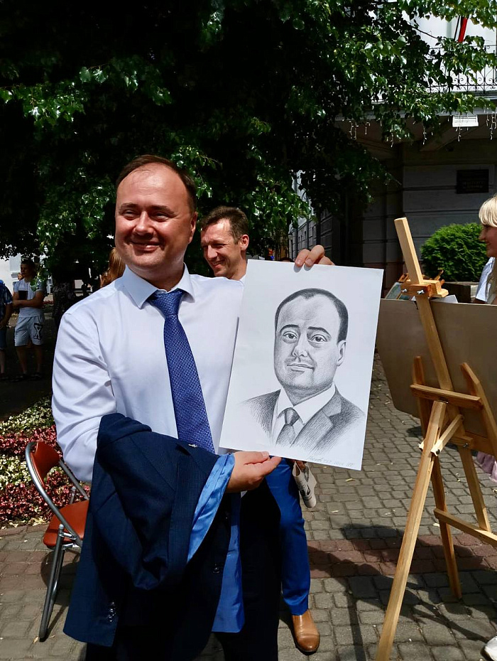 Делегация Ярославля совершила прогулку по улице Ленинской, которая на время Дня Могилева стала праздничной улицей. А уличный художник написал портрет мэра Ярославля.