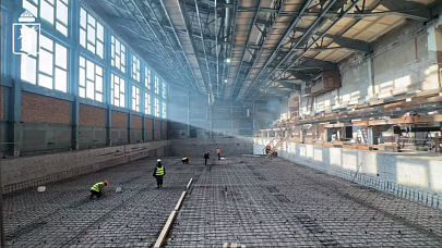 По данным мэрии, на площадке завершены демонтажные работы и уже залит детский бассейн. Сейчас подрядная организация ведет армирование чаши бассейна, предназначенного для маломобильных посетителей. В здании также обновили лестничные проемы с первого по третий этаж.