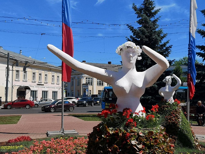 Практически каждый год клумба на площади Волкова меняет свой облик, но неизменна тематика – искусство. Здесь были и театральные маски, и скрипичные ключи. В этом году – три женские танцующие фигуры, чьи юбки оформлены цветами. Что символизируют фигуры – музы, грации, актрисы или кого-то еще, каждый для себя определяет сам.