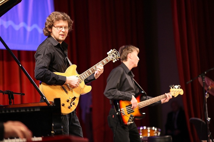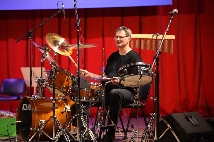 В программе вчерашнего дня фестиваля для этой метаморфозы потребовался один антракт на 15 минут. Столько времени потребовалось, чтобы на сцене появились архангельский барабанщик Олег Юданов, московский саксофонист Алексей Круглов и профессор таллинской ритмической академии, гитарист Яак Соояар. Программа, которую они представили, не была, строго говоря, сугубо джазовой. Это пиршество звуков равно относилось к джазу, авангарду, академической музыке – а когда Алексей принимался прямо во время исполнения читать стихи, то и к творчеству обэриутов. Такую музыку играют явно не для развлечения – как минимум, ею пытаются преобразить мир. Получается ли?