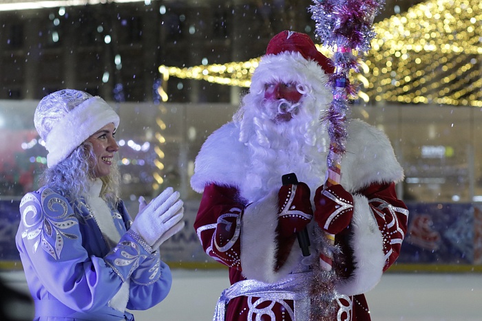 Конечно же, не обошлось без главных героев праздника – Дедушки Мороза и Снегурочки. Они вместе с детьми, пришедшими на каток, даже приняли участие в разминке, которую провела мастер спорта международного класса по прыжкам на батуте Алла Шаяхова.