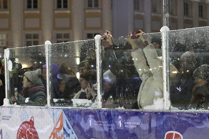 Атмосфера праздника чувствовалась в этот вечер уже благодаря кружащимся в воздухе снежинкам и комфортной погоде. Ярославцы выстроились в очередь на каток еще до его открытия: желающих прокатиться на коньках было немало.