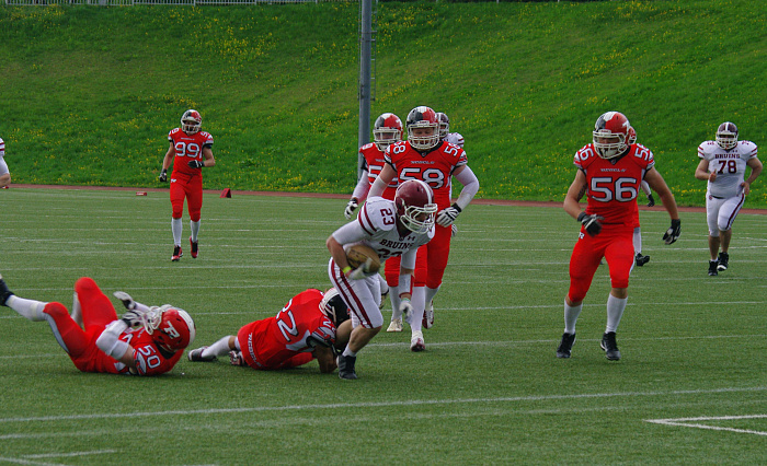 В перерыве зрителям не давали скучать: группа поддержки, конкурсы для болельщиков и радуга, которая грозила стать самым ярким зрелищем вечера. Однако дождь, зарядивший еще до возобновления игры, оказал на команды какое-то живительное влияние. Правда, трибуны это обрадовало не особенно, поскольку практически сразу же москвичи реализовали тач-даун и реализацию – 10:0 в их пользу. Правда, до конца игры оставалось еще немало времени – и «Бунтари» сумели ответить тем же – счет стал 7:10 и в концовке игры у тех же правых по отношению к трибуне ворот повторилась ситуация первого тайма. Только что удар по воротам Антон Поляков наносил метров с тридцати – но попал между стойками и сравнял счет. В овертайме право на первую атаку получили «Брюинс», но во второй попытке их игрок выронил мяч, который был перехвачен ярославцами. И снова право на решающий удар наши игроки доверили Антону Полякову – и тот их в очередной раз не подвел. 13:10 – новый сезон стартовал с победы «Бунтарей».