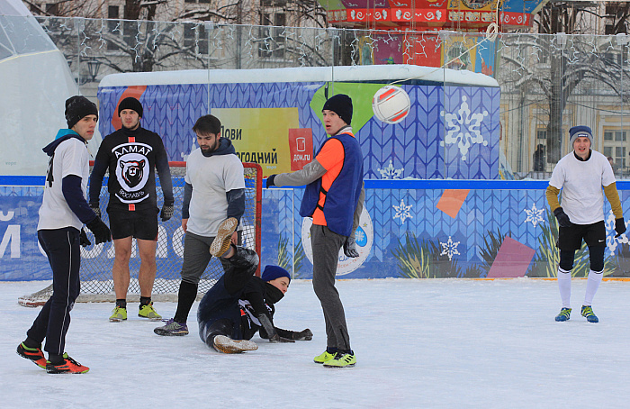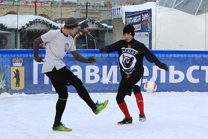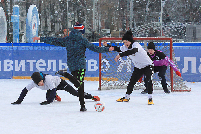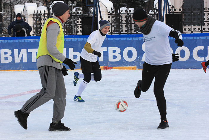 Сегодня днем на Советской площади прошел открытый чемпионат города Ярославля по футболу на льду. Такие соревнования в нашем городе проходят впервые.