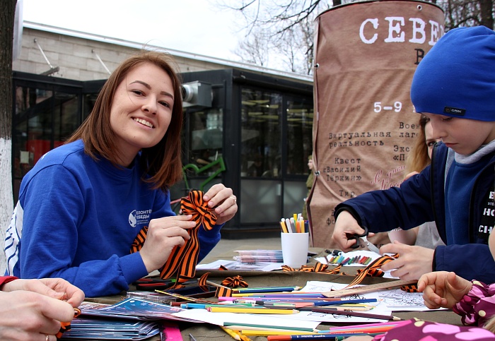 Прошедший весь квест получает в подарок значок. Но на этом возможности площадки не исчерпываются. Можно подойти к столику «Поискового движения России», заполнить нехитрую анкету и узнать о судьбе своего воевавшего родственника. А можно подойти к столику с георгиевскими лентами и научиться делать «георгиевские броши». Занятие нравится не только детям, но и женщинам. Например, москвичка Катерина Шершнева приехала вместе с семьей в Ярославль на праздники, оказалась на «Весне 45-го года» и самым Захватывающим занятием посчитала именно шитье «Георгиевской броши».