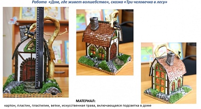 2-е место (215 баллов) заняла «Избушка гномов» Максима Нечаева (школа № 52, г. Ярославль) из сказки братьев Гримм «Белоснежка и семь гномов». Крыша избушки – из чешуи шишек, труба – из мелких камешков кварца, из нее «валит дым» из холлофайбера, для убедительности сказочной атмосферы использованы сухой мох, трава, веточки.