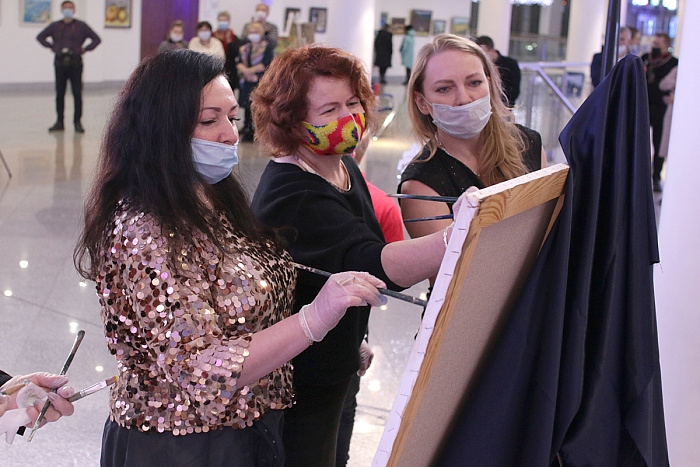 На открытии выставки Алла Хвастунова вместе с учениками создали картину на новогоднюю тематику. Полотно было подарено КЗЦ Миллениум.