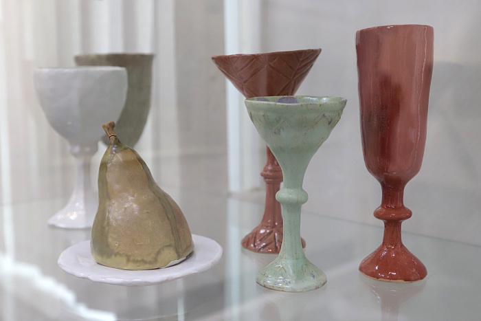 Изысканным комплиментом живописи Ивана Никифорова стали произведения ярославских керамисток Елены Жильцовой и Марины Огурцовой, размещенные в витринах, – парафраз предметов из натюрмортов художника.