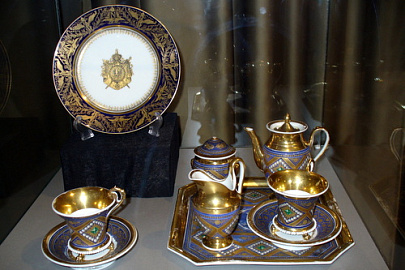 Роскошный фарфор в стиле Людовика XVI представлен изделиями Севрской королевской мануфактуры конца XVIII – XIX века. На посуде запечатлена и история французской революции, и портреты родственниц Наполеона.