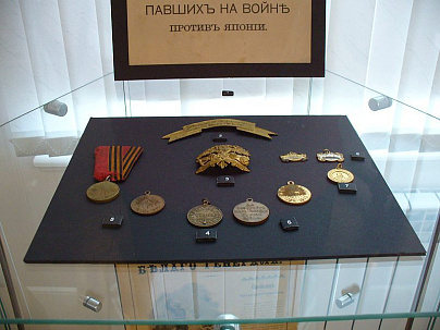 Отдельный стенд посвящен медицинской теме. Здесь можно увидеть вещи и награды ярославской сестры милосердия Екатерины Петровой, фото ярославского санитарного отряда, который отправился в Манчжурию, списки раненых, лечившихся в ярославских госпиталях.