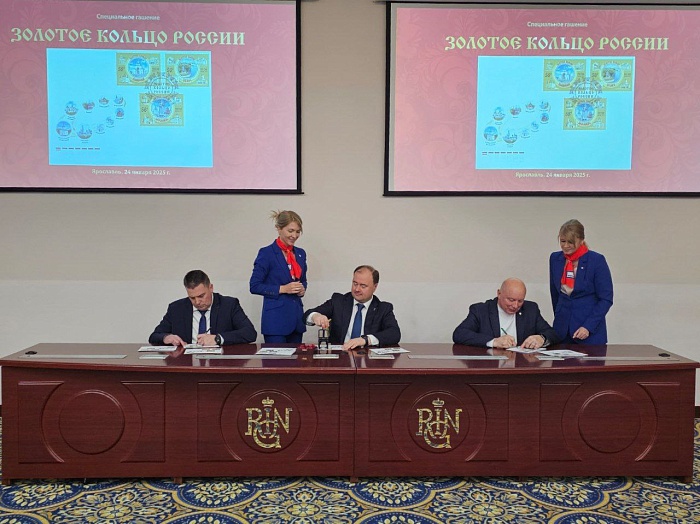 Сегодняшняя дата, 24 января 2025 года, обозначена на штемпеле, которым в Ярославле погасили марки из серии «Города Золотого кольца России». Церемония состоялась в рамках Собрания глав городов Золотого кольца. Участие в ней принял президент Союза городов Золотого кольца мэр Ярославля Артем Молчанов, а также главы Углича и Владимира.