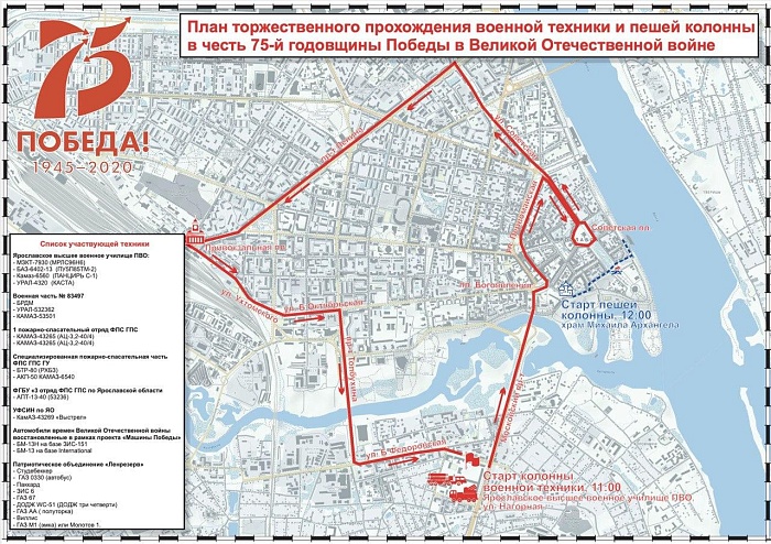 Пешеходная колонна коробок Ярославского территориального гарнизона и УФСИН России по Ярославской области начнет движение с улицы Первомайской, пройдет по Которосльной набережной, направится к «Вечному огню», оттуда - к Волжскому спуску и далее по нижнему ярусу Волжской набережной до Речного вокзала.