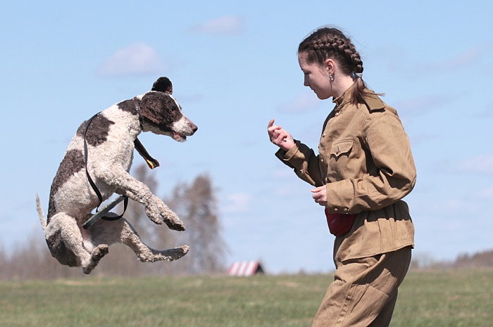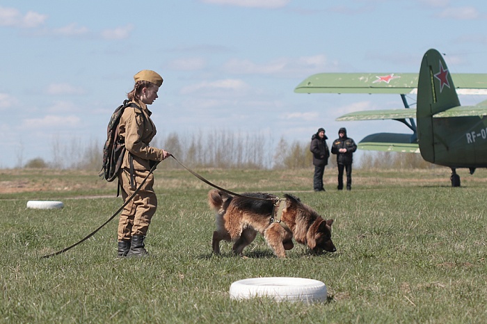 Не только люди, но и собаки воевали. В память о четвероногих героях войны на празднике в Левцово было организованы выступление студентов кинологического отделения великосельского аграрного техникума. Будущие кинологи и их питомцы показывали и выполнение команд послушания, и как собаки находили раненых и помогали выносить их с поля боя на волокушах, и задержание собаками противника, и поиск мин.