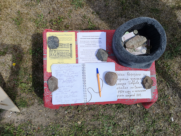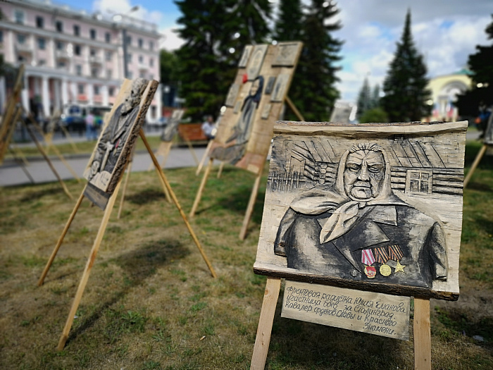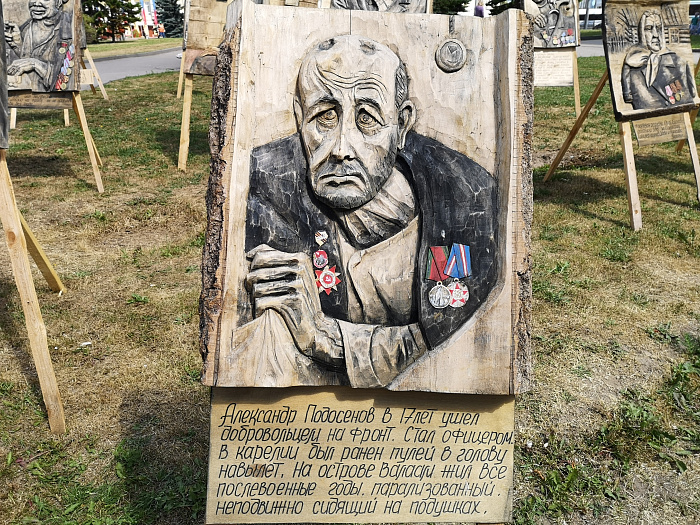 Десятки портретов, вырезанных из дерева, посвящены тем, кто воевал на фронтах Великой Отечественной. Автор – резчик Иван Марценюк. Около каждого портрета – надпись, сделанная от руки черным маркером, с описанием того, кто изображен. Все доски вырезаны по мотивам работ художника Геннадия Доброва, побывавшего на Валааме в 70-х годах.